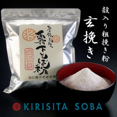 玄そばを綺麗に磨き、殻つきのまま低速回転石臼挽き〜細かい目の篩い(60メッシュ)にかけて仕上げたそば粉。